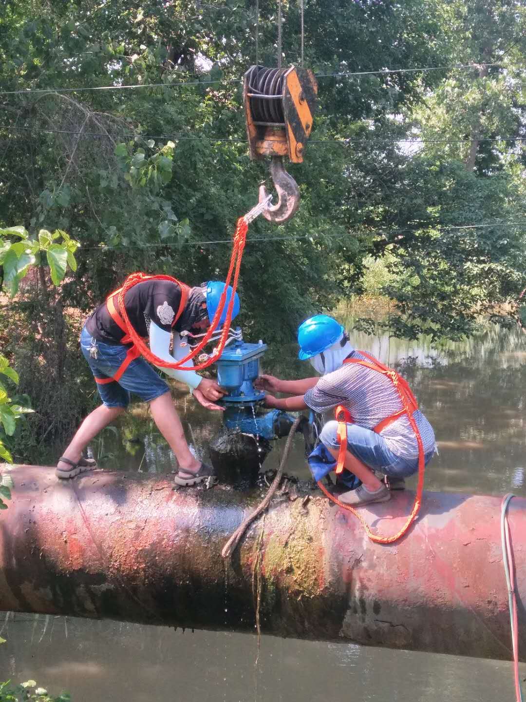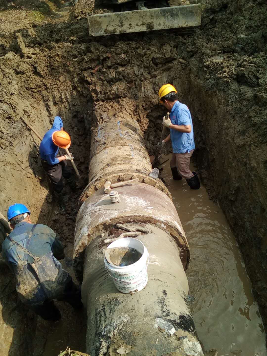 圖為:管道維修工人頭頂烈日,并搶時(shí)爭(zhēng)速,在泥水中搶修237省道通揚(yáng)運(yùn)河段DN800主管網(wǎng)。