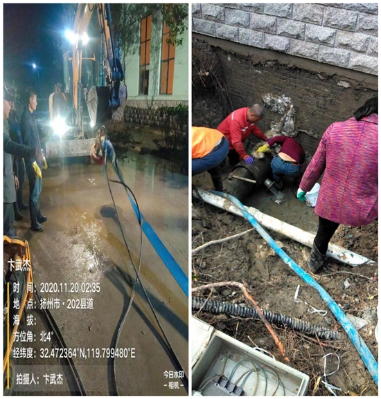 (11月20日凌晨5點。)由于停水后,余水不斷,且管槽較深,大約挖至1.8米,破損的管道才顯現(xiàn)出來,是口徑DN375鋼管漏水。經(jīng)過排查,維修人員(于凌晨6點)精確到了管道上的漏水點。