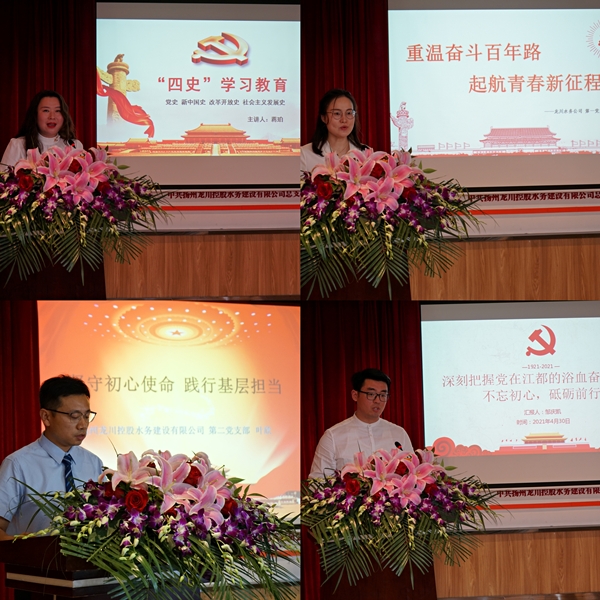 圖為龍川水務(wù)公司四名參賽選手登臺開講瞬間
